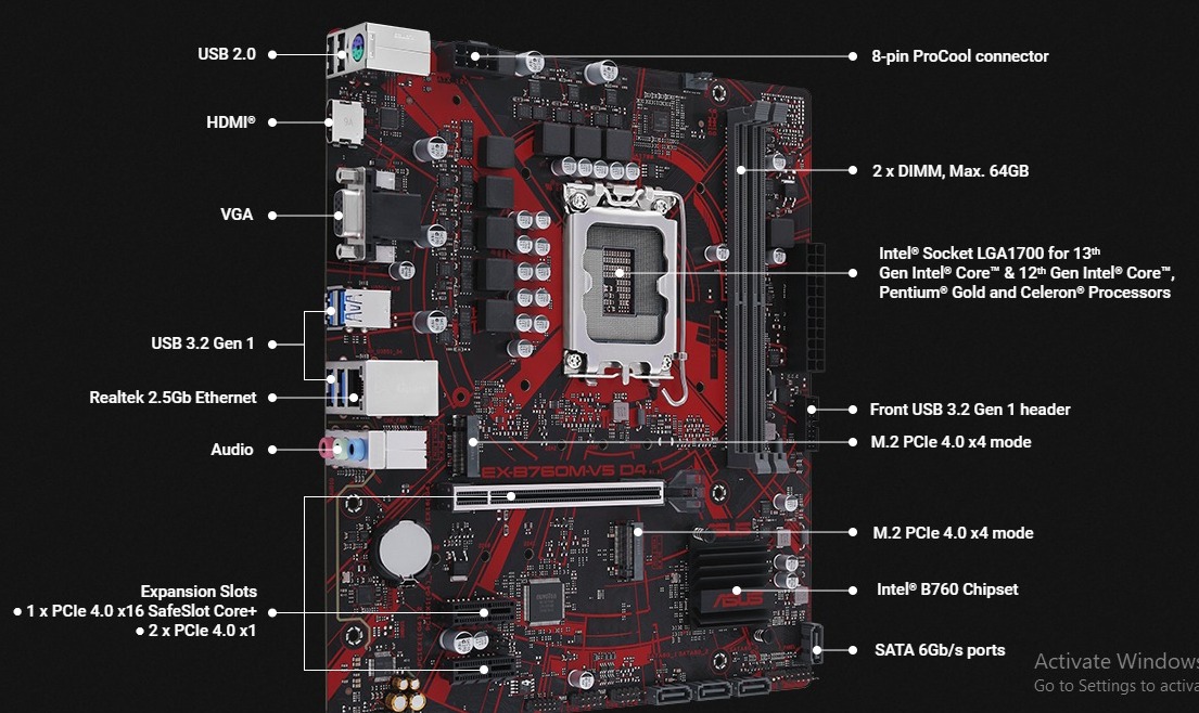 Introducing the Asus EX-B760M-V5 D4 motherboard, a state-of-the-art motherboard designed to take your computing experience to new heights. Powered by the advanced B760 chipset and equipped with LGA 1700 compatibility for 13th and 12th generation processors, this motherboard sets the stage for exceptional performance and versatility.