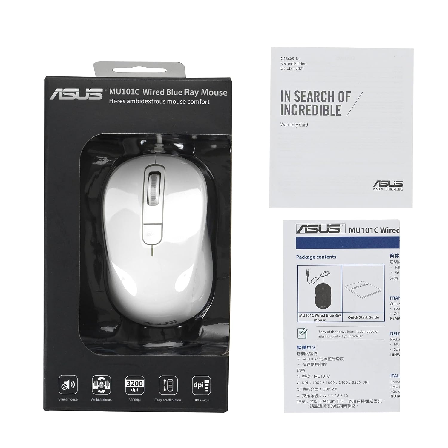 DPI Switch Button: The Asus MU101C mouse is equipped with a DPI switch button that allows you to quickly adjust the sensitivity. Choose from DPI settings ranging from 1000 to 3200 dpi to meet your specific needs. Whether you want precise controls or fast cursor speed, this mouse adapts to your preferences.