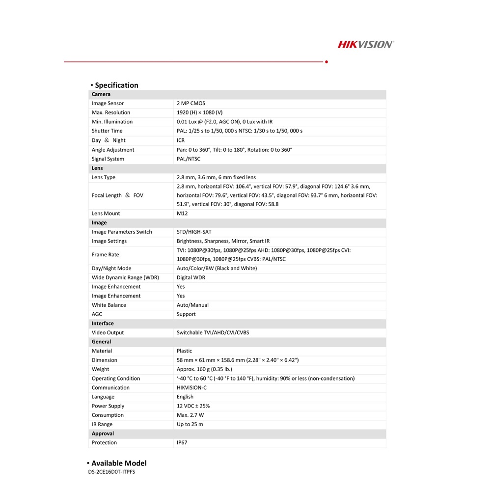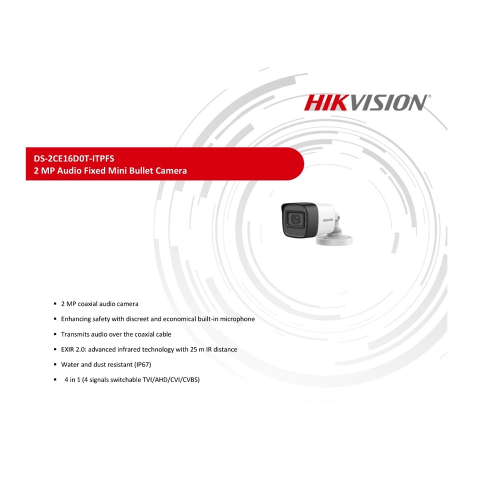 In short, the Hikvision 1080P Exir Bullet Camera DS-2CE16D0T-ITPFS is a versatile and reliable outdoor surveillance solution that combines high-resolution video, powerful IR illumination, weather resistance, signal compatibility and audio recording capabilities. If you need to secure your home, business or outdoor area, this camera is equipped to provide the surveillance you need. Rely on Hikvision's reputation for cutting-edge security technology with the DS-2CE16D0T-ITPFS and ensure your property remains under 24-hour surveillance.