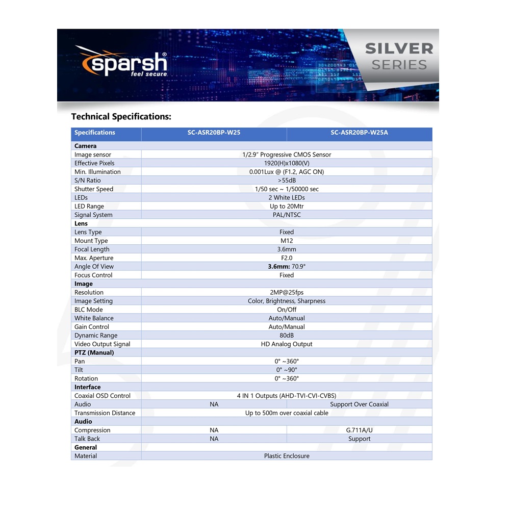 Upgrade your security infrastructure with the Sparsh 2MP Color+ AHD Bullet CCTV Camera – where cutting-edge technology meets elegant design. Experience the future of surveillance with color-enhanced night vision, audio capabilities, and versatile customization options. Choose Sparsh for a comprehensive and reliable solution to safeguard your surroundings.