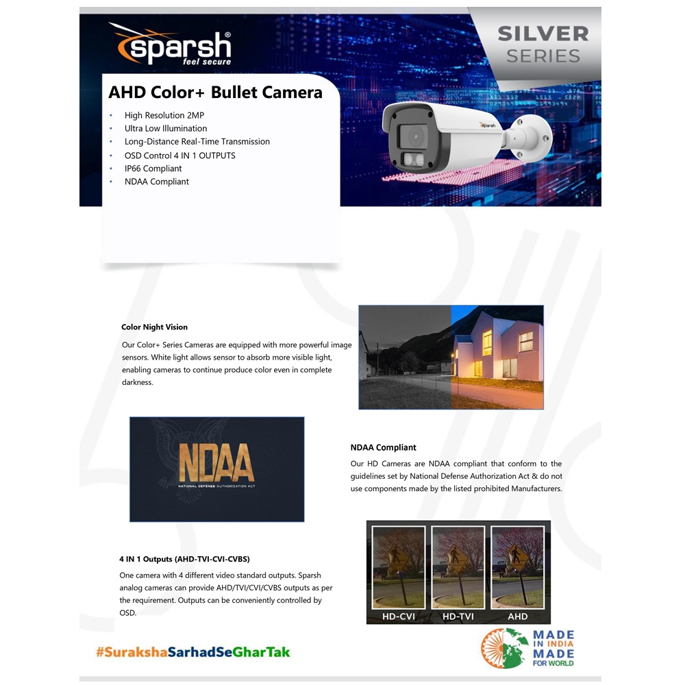 Equipped with a 3.6mm lens, the Sparsh Color+ AHD Bullet CCTV Camera captures every detail with precision, ensuring a wide field of view for comprehensive surveillance. What sets this camera apart is its unique Color Night Vision technology, allowing it to deliver vibrant and detailed footage even in low-light conditions, ensuring your security is not compromised after dark.