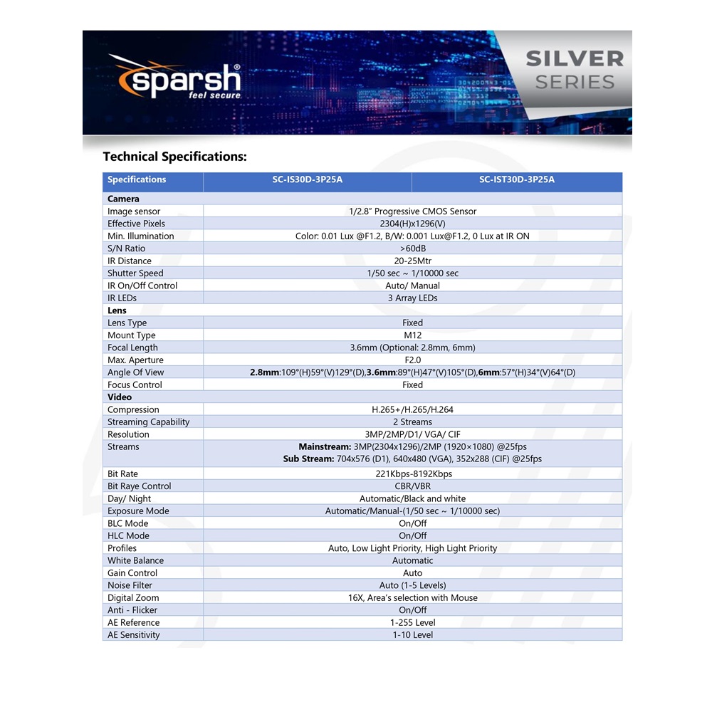 Introducing the Sparsh 3MP IP Dome CCTV Camera, an advanced surveillance solution that sets the standard for security excellence. With a 3.6mm lens, built-in audio capabilities, and innovative features such as 3 Array LEDs, Smart IR technology, and AI augmentation, this dome camera provides comprehensive monitoring for diverse security needs.