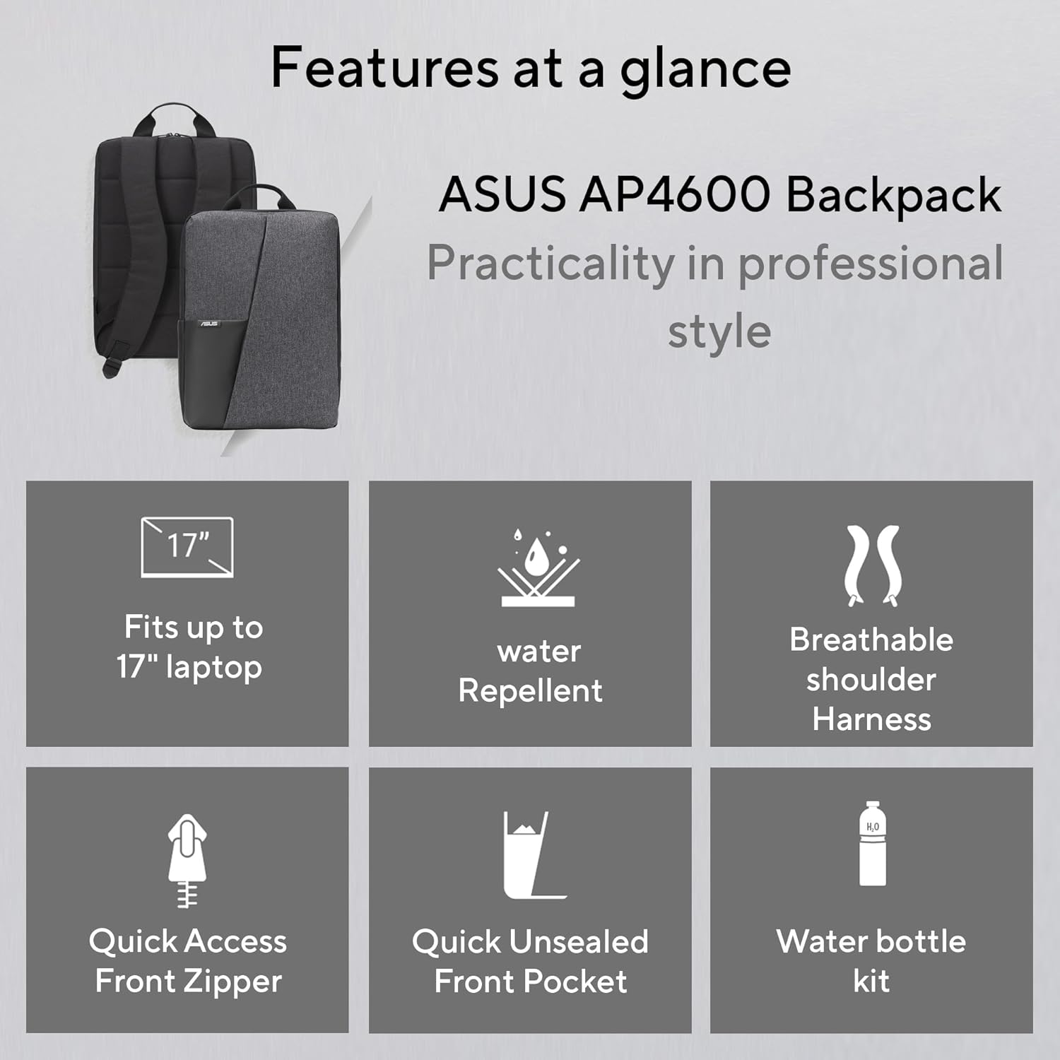 Introducing the Asus AP4600 17-inch Backpack, a lightweight, practical and durable companion for people on the go. This versatile gray backpack, model 90XB08LO-BBP010, features a water-repellent exterior and is designed to carry not only your laptop but also essentials like your phone, power bank and water bottle. Thoughtfully designed.