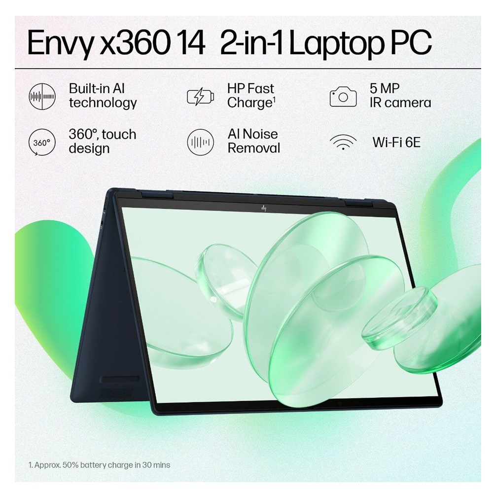 Introducing the HP Envy x360 2-in-1 Laptop, a fusion of style, performance, and versatility designed to revolutionize your computing experience. Encased in an elegant Atmospheric Blue chassis, this 14-inch powerhouse is as visually striking as it is technologically advanced.
