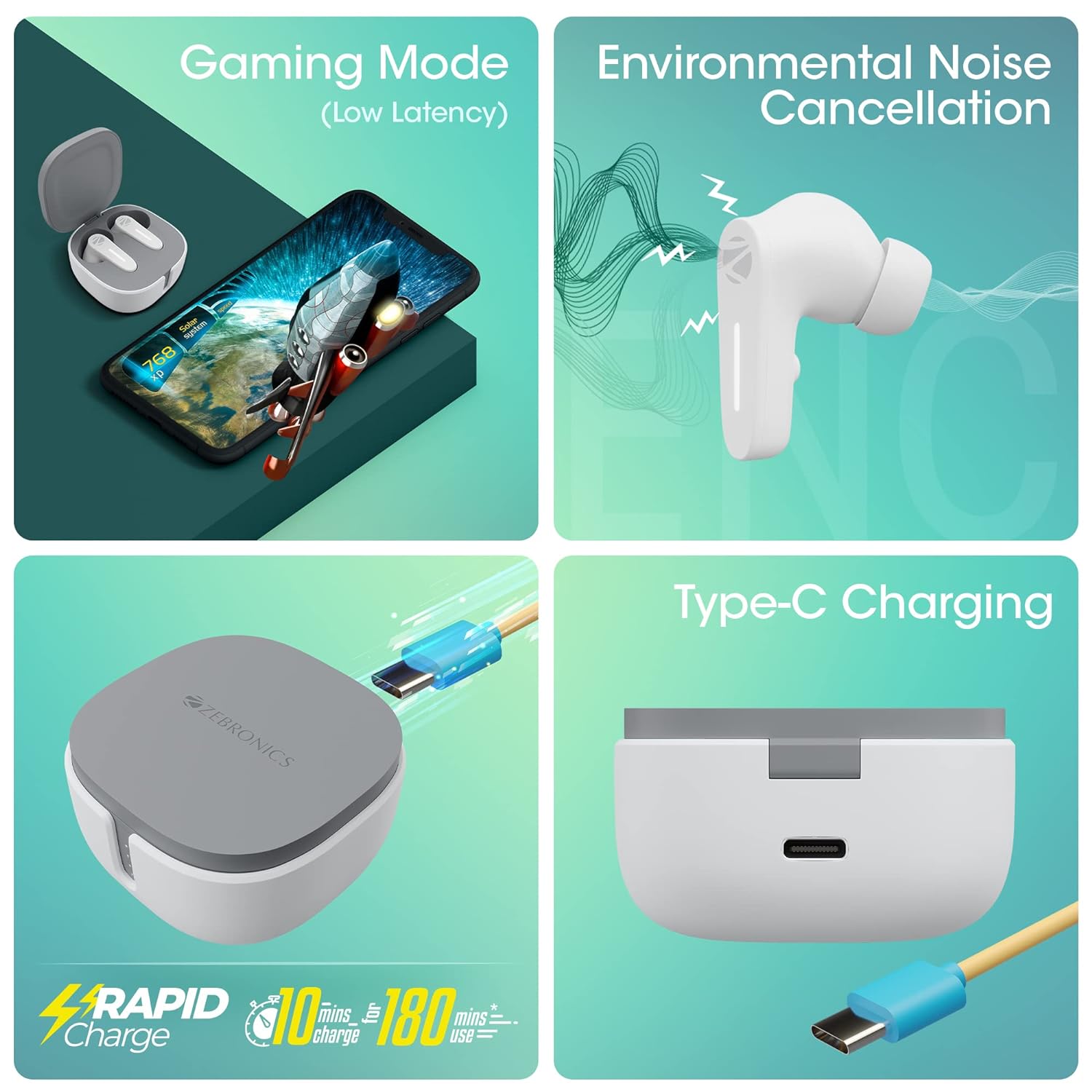| Feature | : | Wireless Stereo Sound , Upto 40 h* battery life with Charging Case, Call Function, Type-C Charging, Built-In Rechargeable Battery, Environmental Noise Cancellation, Gaming Mode ,Rapid Charging, Splash Proof |
